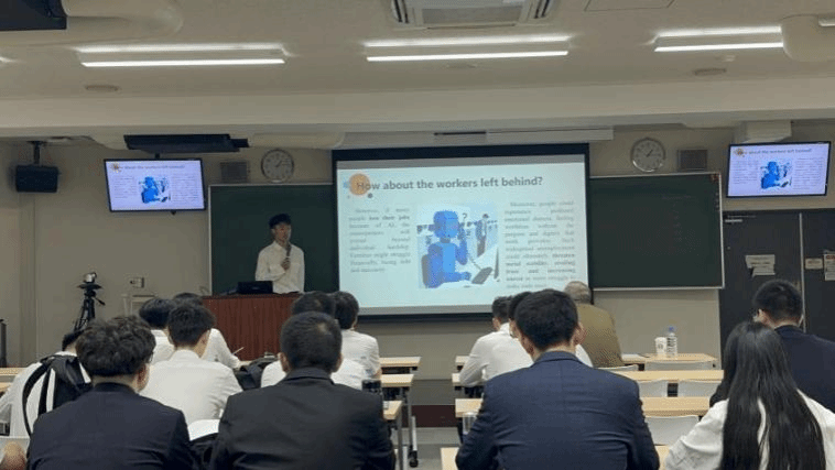 《日常生活中的人工智能影响》聚焦人工智能如何渗透并改变衣食住行等日常生活场景,《人工智能对日本工业与创业公司的作用》剖析技术驱动产业升级的路径。机制2202班李俊哲谈到:“通过系列课程,我们在理论与实例之间的探索中,进一步认识到人工智能不仅是实验室里的代码,更是重塑社会生活与经济生态的力量。这让我为专业学习锚定了现实目标。”