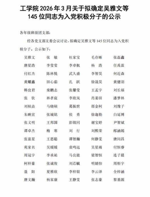 【本】工学院2026年3月关于拟确定吴雅文等145位同志为入党积极分子的公示